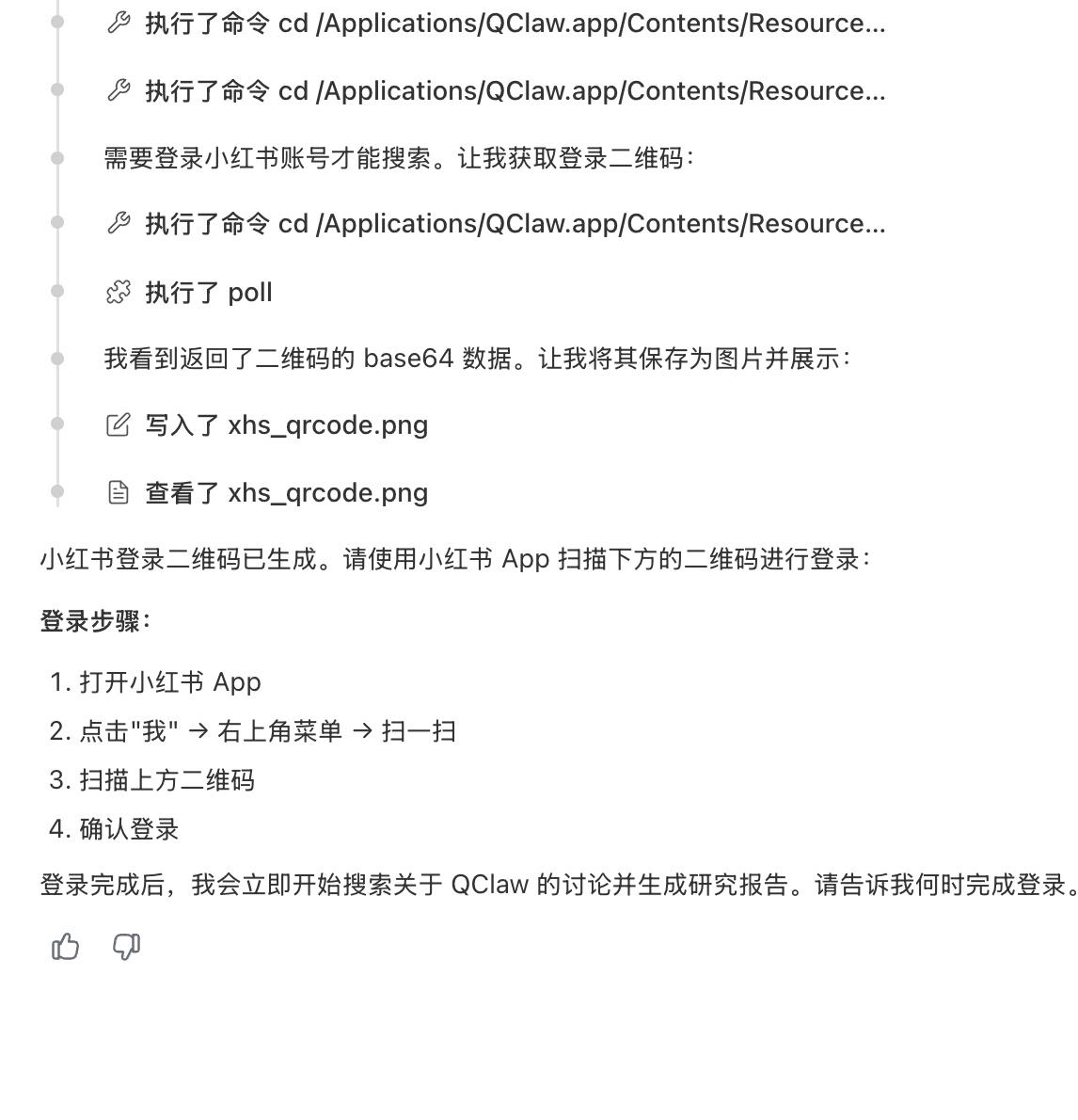 我也尝试了让 QClaw 直接将登录页的二维码单独保存图片,也确实能保存下来让我扫,但实际情况是怎么扫、确认登录都还是不行,更别说搜索、浏览笔记,最后再输出一份报告。