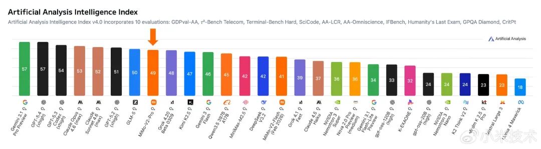 MiMo-V2-Pro是此次发布的核心。该模型拥有逾1万亿总参数、420亿活跃参数及100万token上下文窗口,在全球大模型综合智能排行榜Artificial Analysis Intelligence Index上位列全球第八、中国模型第二,超越xAI Grok,仅次于Gemini 3.1 Pro Preview、GPT-5.4、GPT-5.3 Codex、Claude Opus 4.6、Claude Sonnet 4.6及GLM-5。