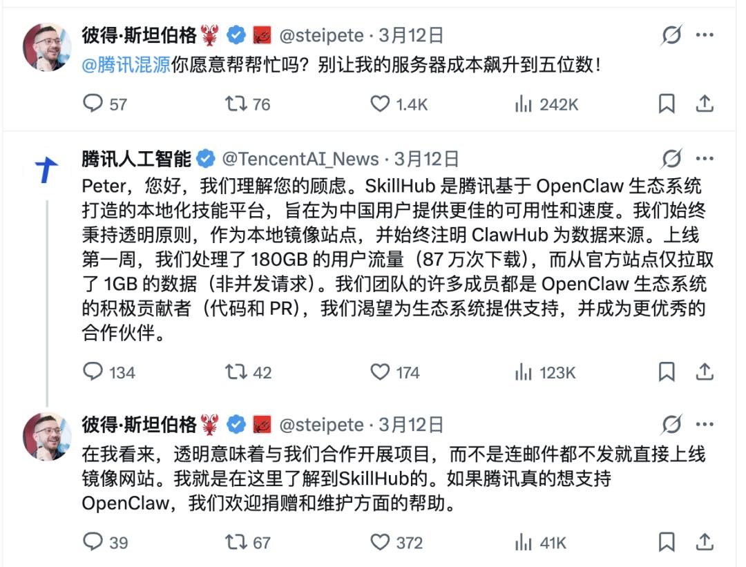 同样的,不久前OpenClaw(龙虾)热的时候,腾讯一口气推出了近十款各种口味的龙虾。这也引得OpenClaw创始人Peter Steinberger公开指责腾讯旗下AI平台SkillHub“抄袭”其开源项目ClawHub,称对方在未提供任何支持的情况下大规模抓取数据,导致其服务器成本飙升至五位数美元。