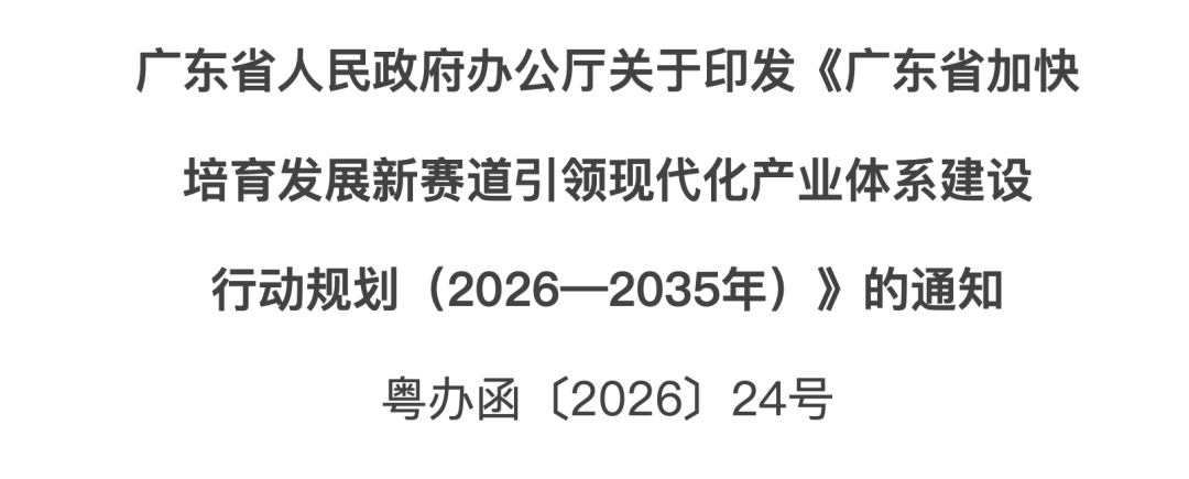 C114讯 3月20日消息(云青)近日,广东省人民政府办公厅印发了《广东省加快培育发展新赛道引领现代化产业体系建设行动规划(2026—2035年)》。
