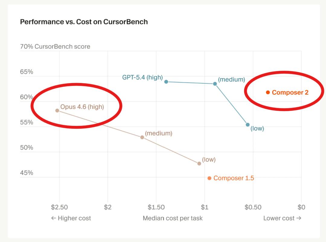 其最新编程模型Composer 2,不仅能力超越Claude Opus 4.6,关键是价格降了非常多。