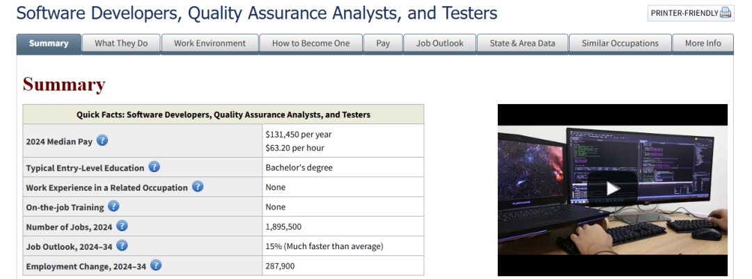 美国劳工统计局预测2024-2034软件岗增长15%。