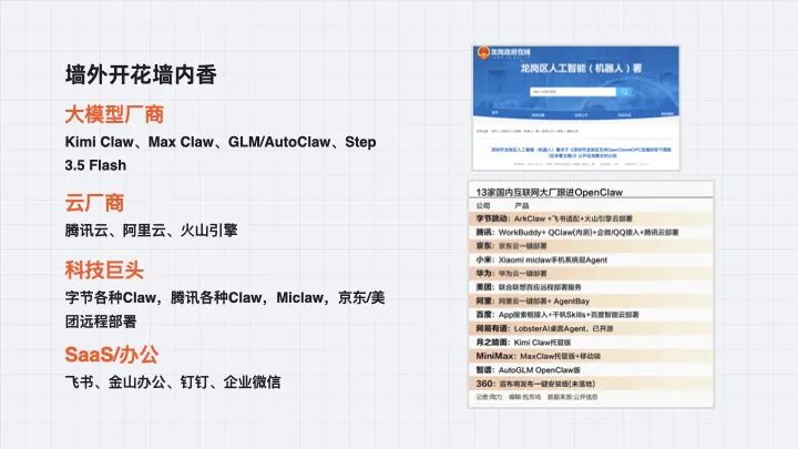 大厂内部也在卷。腾讯电脑管家团队做了 QClaw,代码软件 toB 的 WorkBuddy 也做了。字节有方舟的,有飞书秒搭的。小米也做了 MiClaw,自称智能体,但有争议。荣耀说自己的 MagicPad 4 可以部署 OpenClaw。
