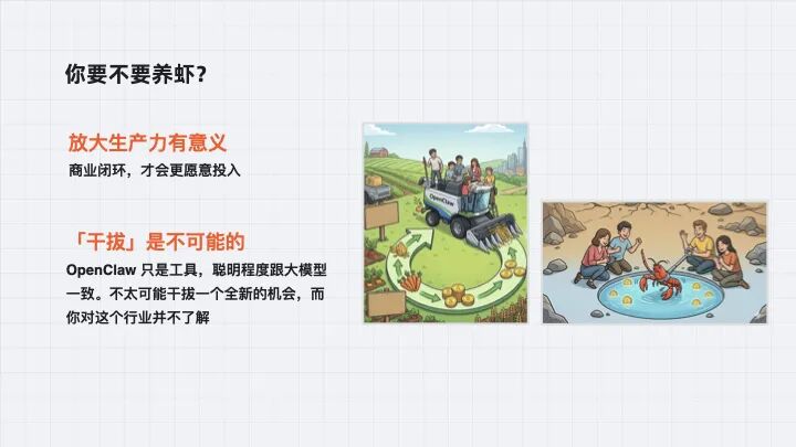 有一个尝鲜者悖论:现在最早用得爽的人,是未来最可能被替代的人。你现在用它解决很多问题解决得很好,这些任务未来都会被 AI 解决掉。你现在养的虾,别人养的虾,未来可能就成了你的替身。