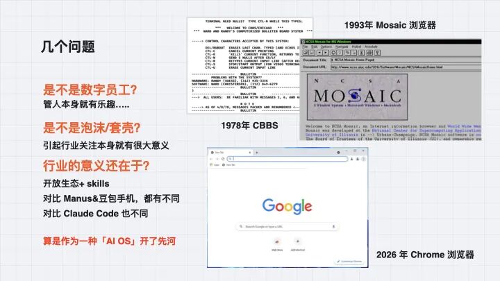所以现在楼下摆摊装 OpenClaw 说是为了抢入口,我觉得就是白扯。装的那些东西跟未来真正能用的产品没有任何关系。