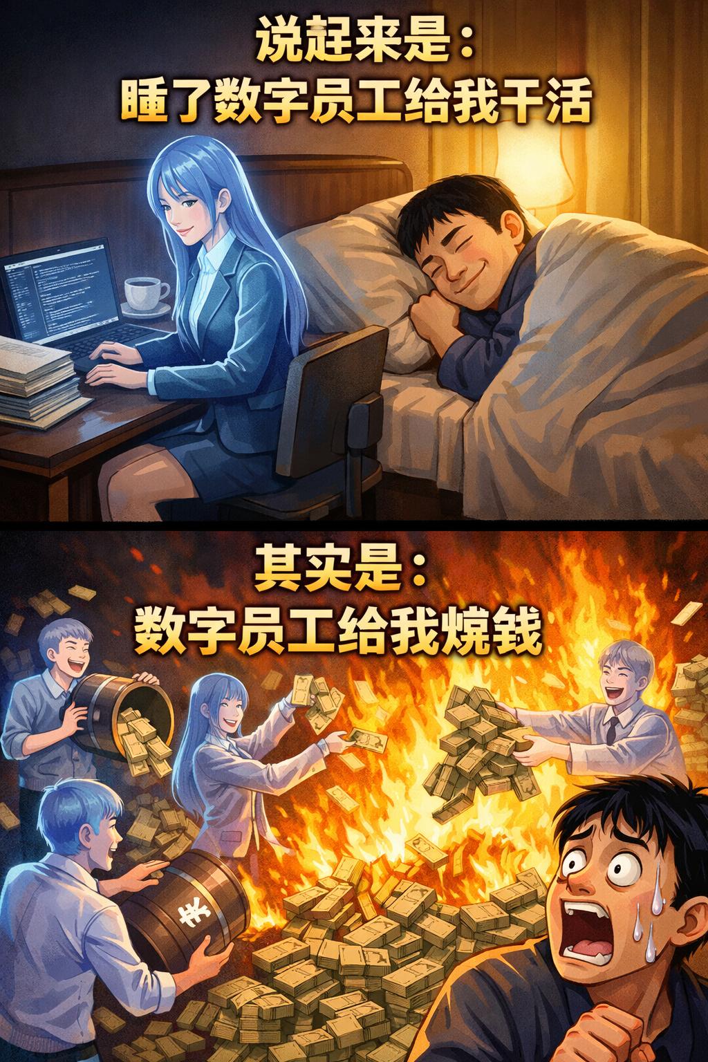 多 agent、使用浏览器、阅读核心文档,都需要大量 token。而且 24×7 运转——好的方面是全自动。说起来是,睡了数字员工给我干活;其实是,数字员工给我烧钱。