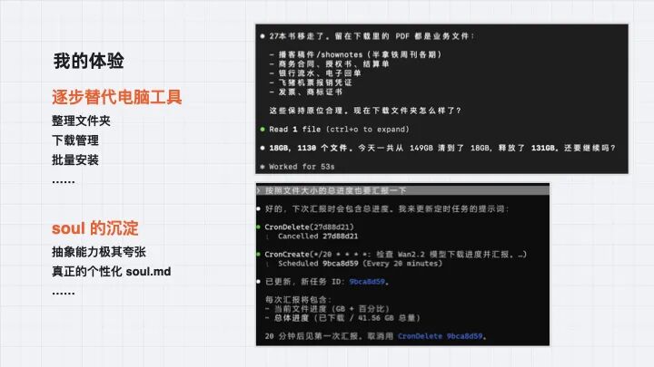 Peter 在播客里举了一个例子:他的朋友让 OpenClaw 写年终总结,结果比他想象的还要好。他去看操作记录,发现 OpenClaw 找到了电脑里他每周不定时的录音,这些录音记载了日常想法,据此写了年终总结——它掌握的信源比本人已知的还要好。