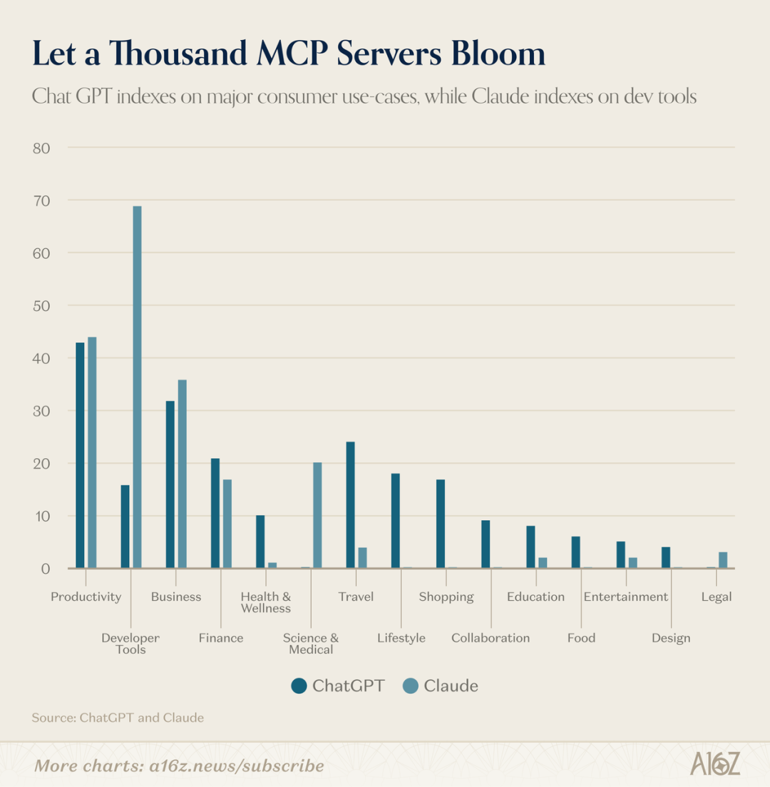 话虽如此,我们看到的,用分化这个词可能不太准确,但或许可以说是人们使用的产品数量以及他们为不同目的使用不同产品的情况正在扩大,这在某种程度上改变了市场份额。Claude尤其专注于专业消费者,推出了像是Cowork Claude、Code Claude,以及集成到Excel和PowerPoint等功能。如果你看看Claude和ChatGPT上出现的应用商店,它们都有200多个应用,但重叠率只有11%。Claude确实专注于高端数据源、研究工具、科学工具、金融数据。而ChatGPT则专注于消费者市场平台、旅游、营养、个人消费金融等领域。然后Gemini也有自己独特的一席之地,它的吸引力很大程度上是由创意工具驱动的。