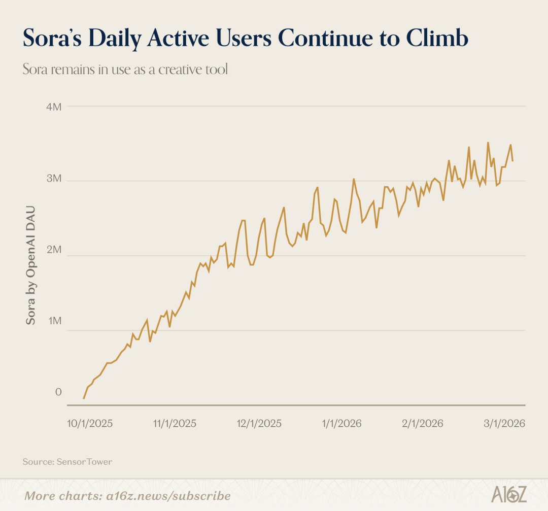 从数据来看,他们的发布非常成功。它连续20天在美国App Store排名第一,这非常难做到。这意味着你可能要达到App Store榜首。要达到这个位置,每天可能需要15万的下载量。所以这是一个很高的下载量,他们实际上比ChatGPT本身更快地达到了100万用户。所以发布非常成功。实际上,很多人低估的是,它的使用量仍然非常可观。根据Sensor Tower的数据,有300万DAU(日活跃用户),这已经很不错了。Sora下降的是新增下载量。他们可能在11月达到了每月600万的峰值,现在看起来是150万左右。