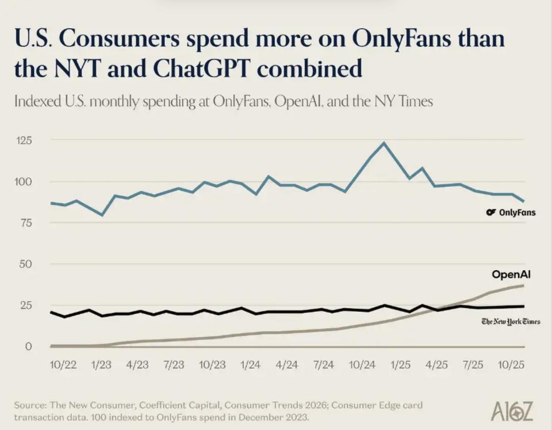 A16Z,硅谷投资圈的顶流 VC,出了一份研究 AI 消费趋势的报告。这份本该正经讨论 AI 生产力的报告里,藏着一页让人哭笑不得的折线图:去年美国用户花在 OpenAI 和纽约时报上的钱,加起来还没有花在 OnlyFans 上的多。