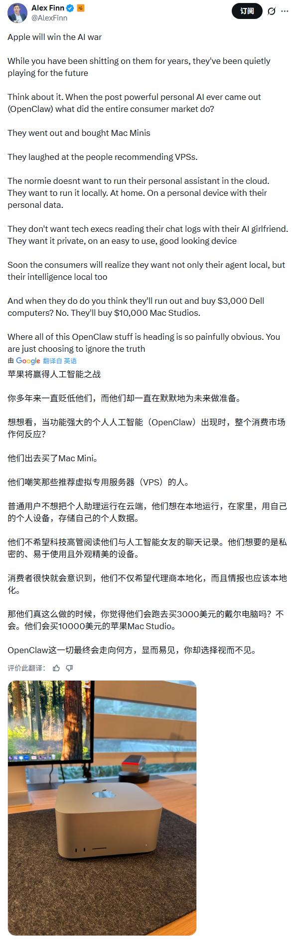 Creator Buddy创始人兼CEO亚历克斯·芬恩(Alex Finn)对此判断称:苹果将赢得AI之战。他认为,当功能强大的个人AI出现时,消费市场的反应已经说明了问题,人们出去买了Mac Mini。