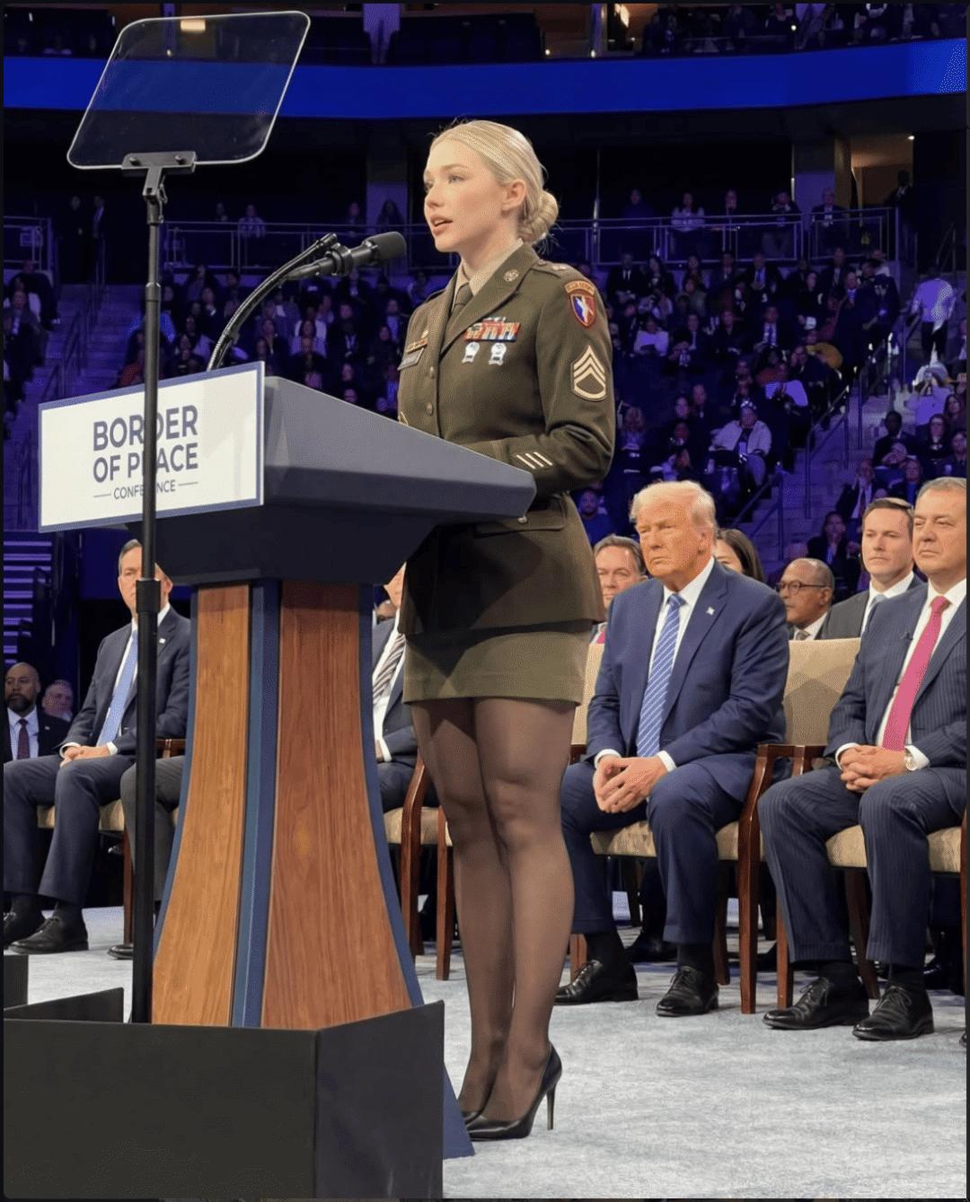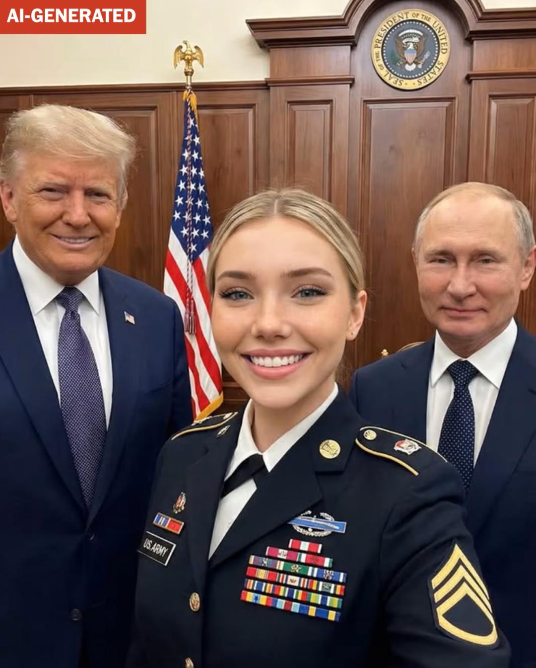 照片里,一位金发碧眼的美国女兵,时而身着迷彩服穿梭在中东沙漠,时而与特朗普总统在机场停机坪上并肩而行,甚至出现在与普京、泽连斯基的外交峰会现场。