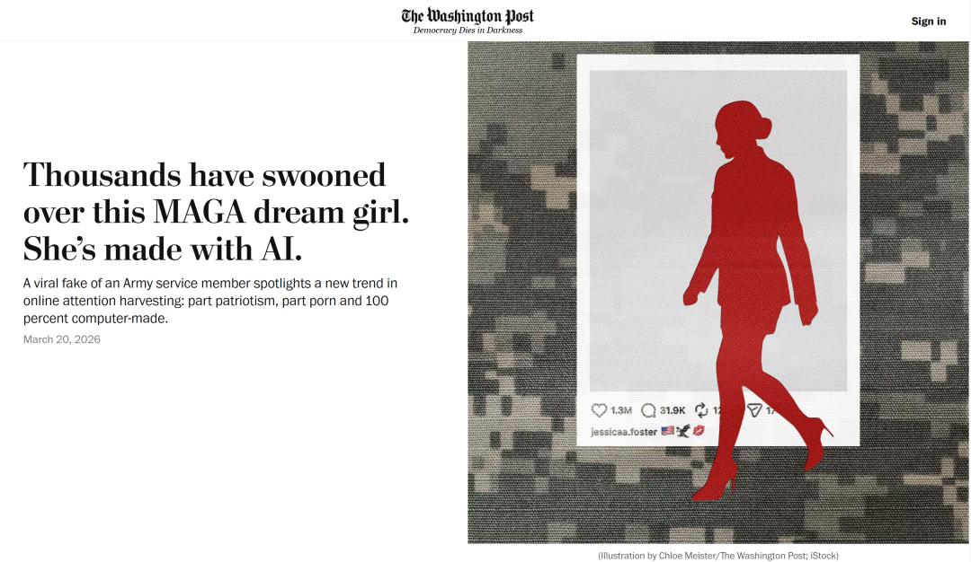 3月20日,《华盛顿邮报》披露,这个账号从头到尾都带着典型的 AI 破绽:美国陆军查不到Jessica Foster的服役记录。