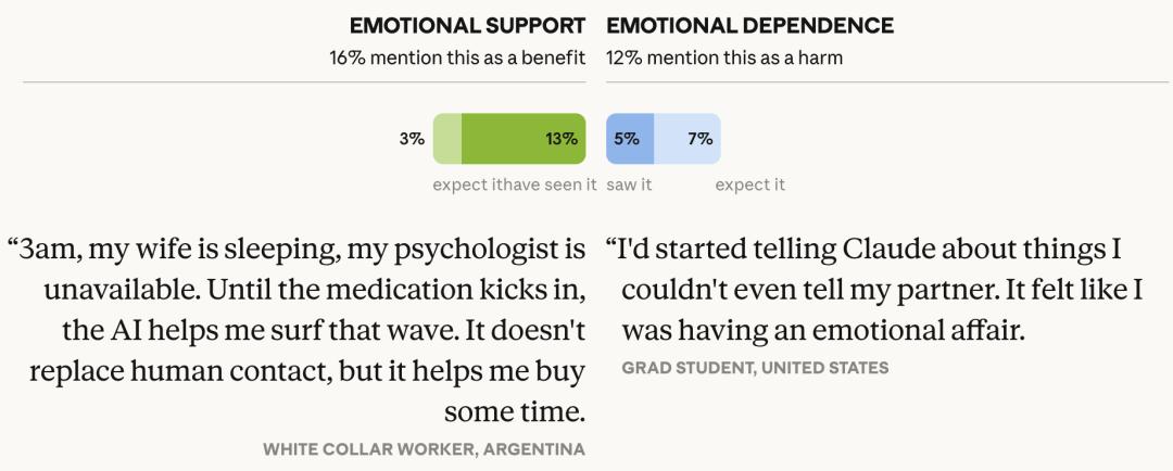 16%的人提到AI的情感支持,12%担心产生依赖。关键数据:享受AI情感支持的人,对AI产生依赖的概率是普通人的3倍。这是五对矛盾中纠缠最深的一对。