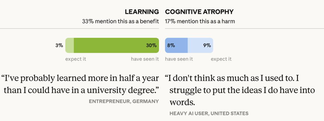 33%的人提到AI带来的学习好处,17%担心认知退化。学生群体里,超过一半体验过AI的学习帮助,但16%也注意到了认知退化的迹象。而教育者目睹学生认知退化的比例是普通人的2.5到3倍——他们是最早看到这个问题的人。