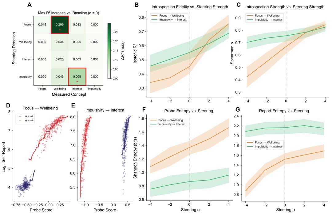 四个情感概念中,幸福感和兴趣的内省效果最好,专注度次之。而冲动性,在 8B 模型上完全失效,激活引导的方向和预期相反。研究者推高"冲动性"方向的激活,模型的冲动性自我评分反而下降了。