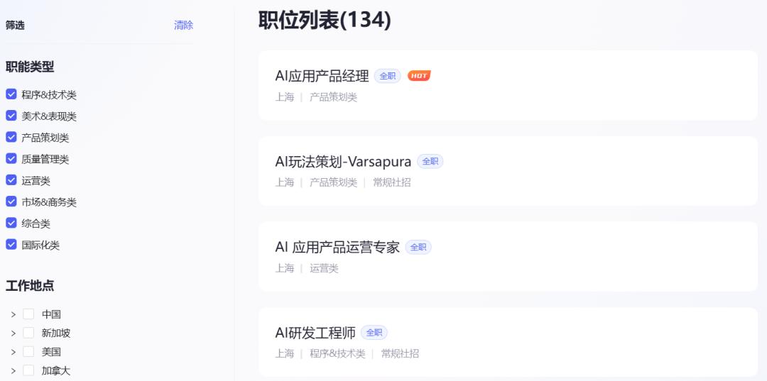 这三家也是对AI人才需求最大的厂商,与AI强相关的玩法策划、引擎开发等岗位偏多(不包括校招岗位)。其他像库洛则有15个AI相关岗位在招——大部分是美术等非编程岗位、莉莉丝则有20个、鹰角为4个总体偏少。