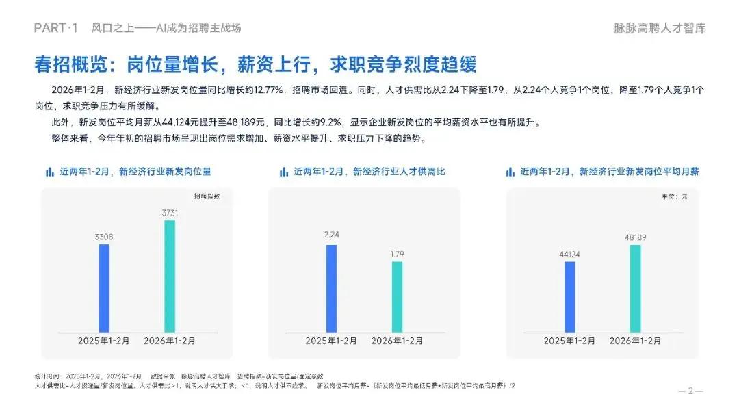 和高薪同时出现的是竞争放缓,2026年1-2月的人才供需比从2025年同期的2.24下降至1.79,从“约2.24人竞争1个岗位”下降至“约1.79人竞争1个岗位”。