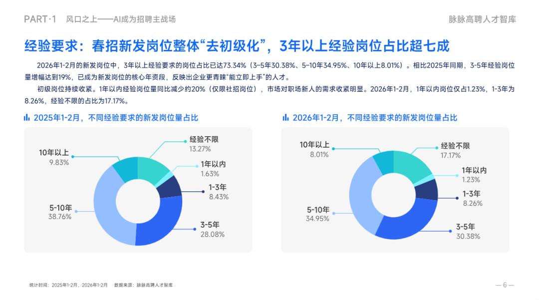 这现状大体符合脉脉在本月初发布的人才招聘报告。该报告称在2026年的1-2月,AI岗位数量同比增长了约12倍,在全部新经济岗位中的占比也从去年的2.29%上升至26.23%。