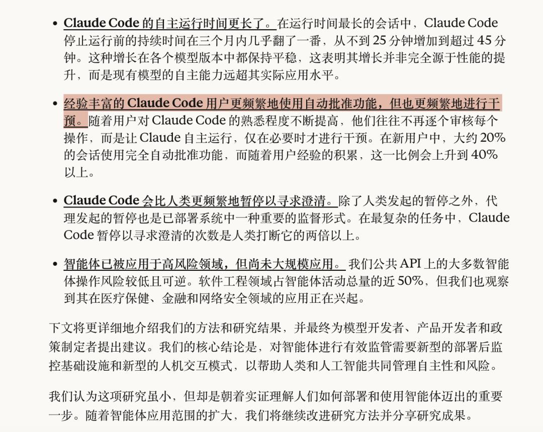 Anthropic 自己的研究也印证了这一点。他们最近发表的一项关于 Claude Code 用户行为的分析显示,新用户大约 20%的时间使用完全自动模式,而使用超过 750 次会话的老用户,这个比例升到了 40%以上。但有趣的是,老用户的「中断率」也同步上升了。他们更放心让 AI 跑,但也更频繁地叫停。这恰恰说明:信任不是「放手」,而是「知道何时介入」。