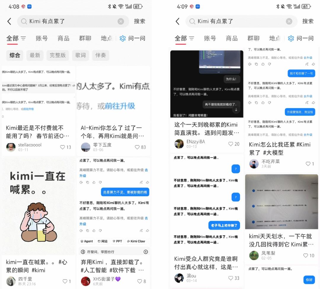 但当我怀着疑惑打开某红书,搜索“Kimi 有点累了”这几个字时,才发现这根本不是什么个例,而是满屏的“灾难现场”。