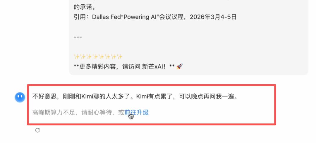 就是开头提到的那句:“不好意思,刚刚和 Kimi 聊的人太多了。Kimi 有点累了,可以晚点再问我一遍。”