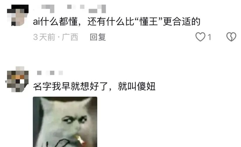 有人喊出傻妞,梦回《魔幻手机》;有人玩谐音梗,叫仝智,“人+工”合体,直指人工智能本质,谐音“同志”。