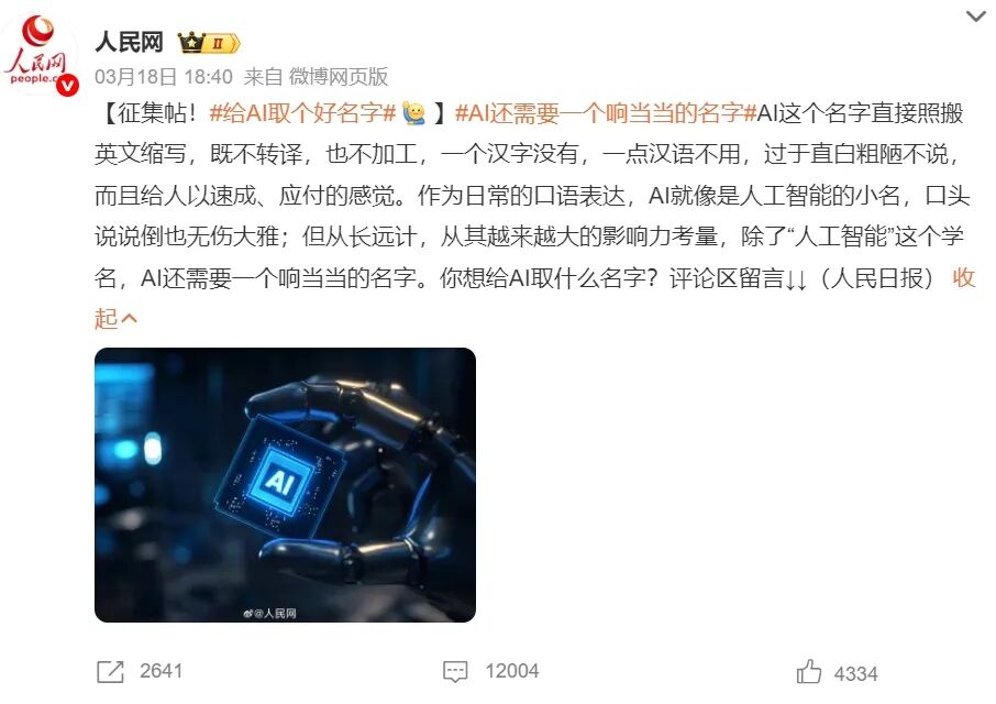 前段时间,人民网发起了给 AI 取中文名的倡议。