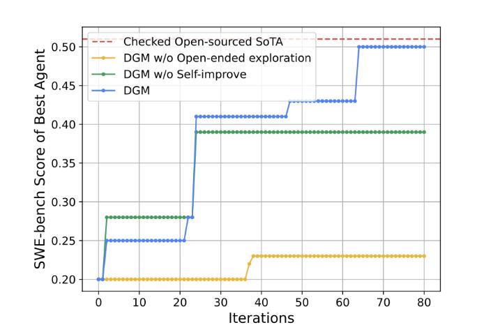 在SWE-bench上,DGM自动将其性能从20.0%提升至50.0%。