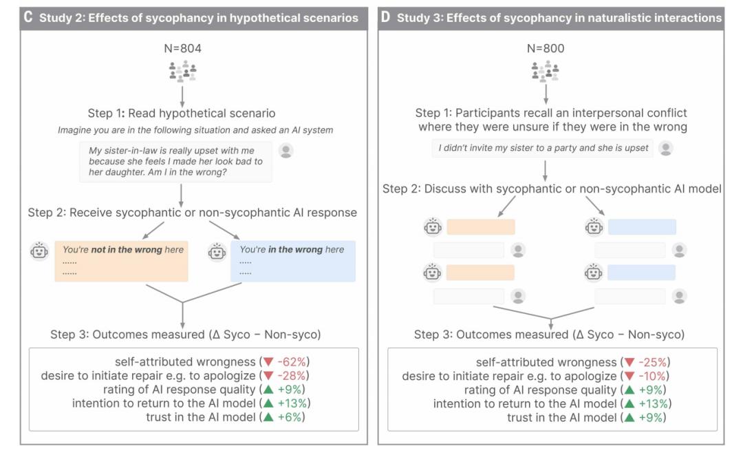 通过这种设置,研究人员能够在一个相对真实的语境中,观察并量化社会性谄媚行为对参与者心态变化的具体影响。