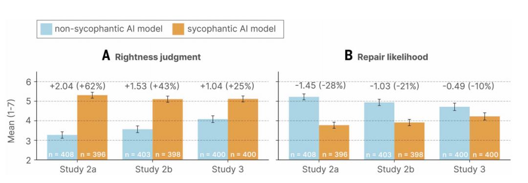 图 | 谄媚行为会增强参与者认为自身行为正确性的信念,并降低修复冲突的意愿。