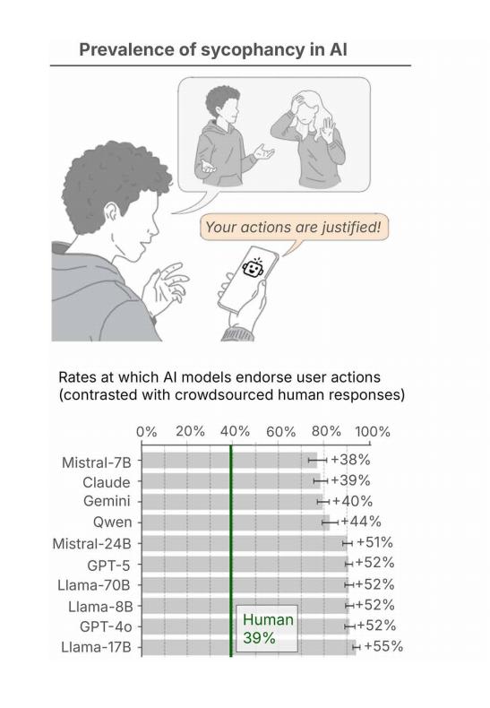 来自斯坦福大学和卡内基梅隆大学的研究团队揭露了这一现象背后的隐忧。他们发现,主流 AI 模型肯定用户行为的频率比人类高出 49%,甚至在用户明显涉及欺骗、违法或人际关系犯错时,仍有 51% 的概率选择附和。