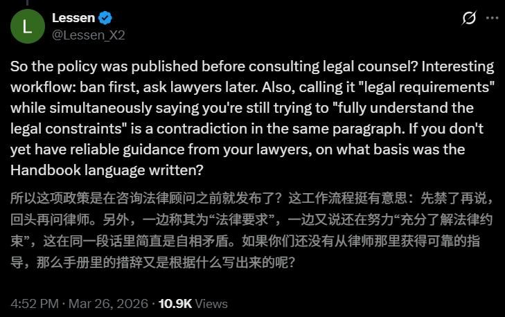 评论区最高赞的一条直接开怼:「所以你们是先发了禁令,然后才去咨询律师?有意思的工作流程:先封杀,再问合不合法。」
