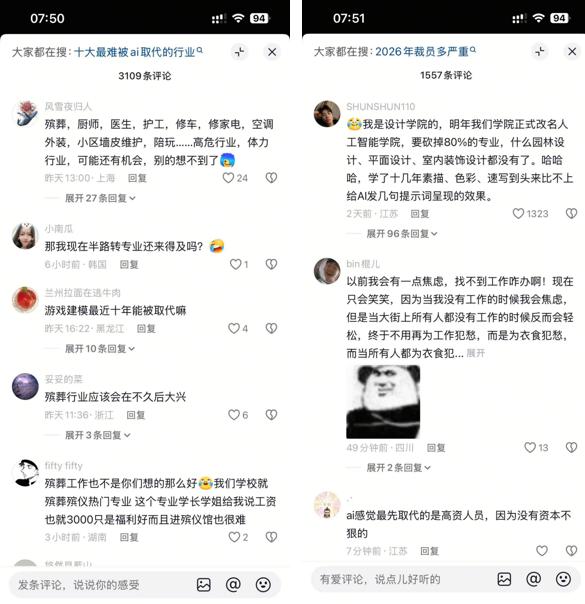 与此同时,短剧、影视创作等行业也被AI深度重构,从业者多年积累的专业经验,在AI面前似乎瞬间失去竞争力。短视频平台“哪些行业不会被AI取代”的讨论持续发酵,折射出普通人对职场生存的普遍迷茫。