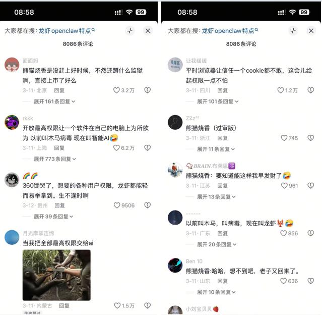 这些离谱的安全漏洞,也引发了网友的犀利调侃:“开放最高权限让软件在自己电脑上为所欲为,以前这叫木马病毒,现在叫智能AI”;“熊猫烧香要是赶上这时候,都能直接上市了”。荒诞的吐槽背后,是普通用户面对AI智能体不可控风险时的无力,更是这场盲目热潮带来的深刻警醒。