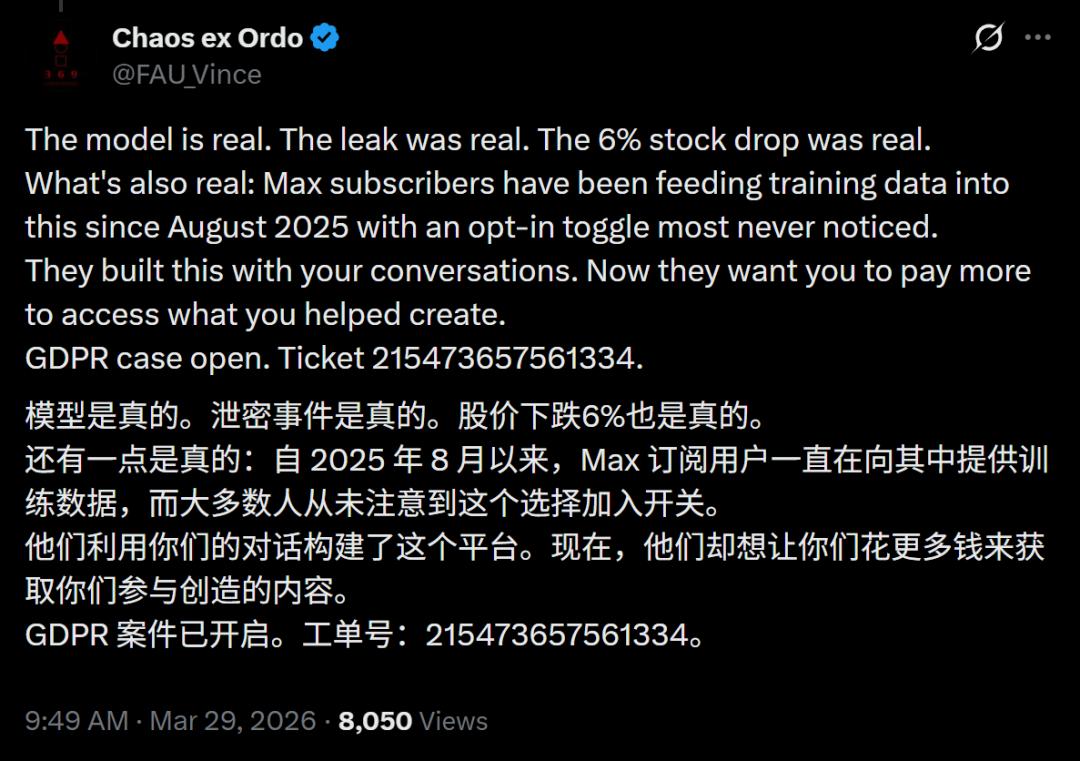 此前根据内部人士的爆料,Mythos 5.0在编码、推理和攻击性安全方面绝对是个怪物,强大到令人难以置信,第一次泄露事件就导致了网络安全股的暴跌。