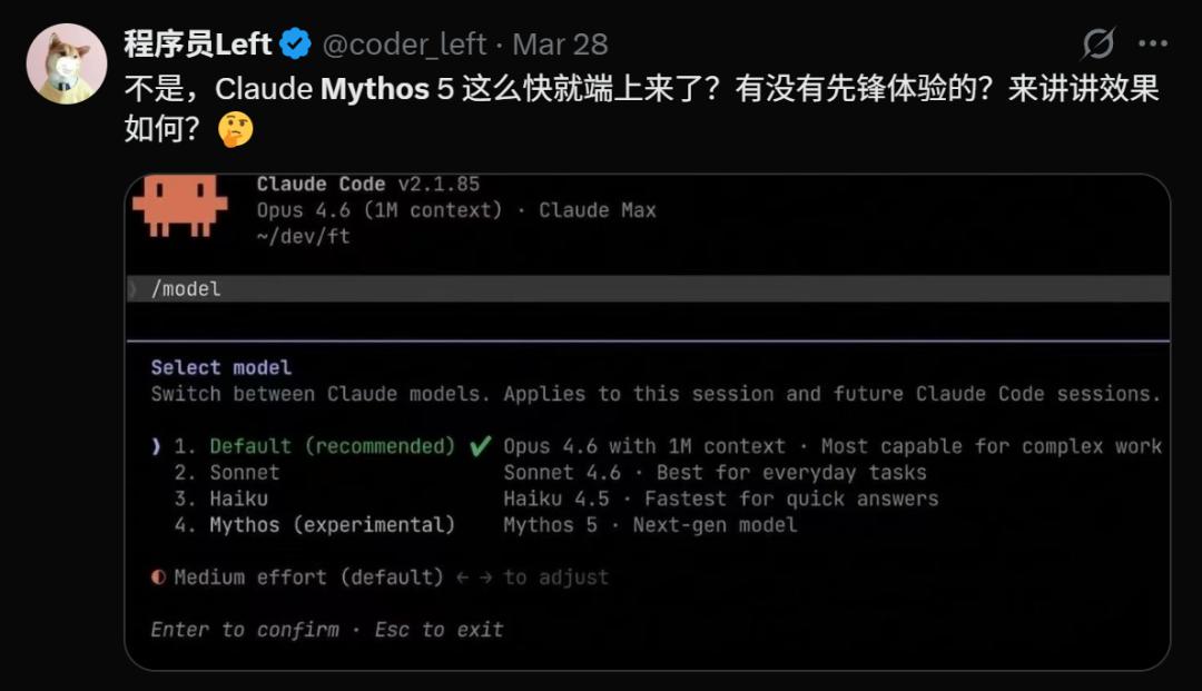 在Claude Code终端里,Mythos 5更是被直接冠以「下一代模型」的称号。