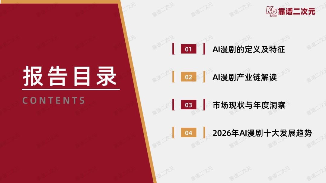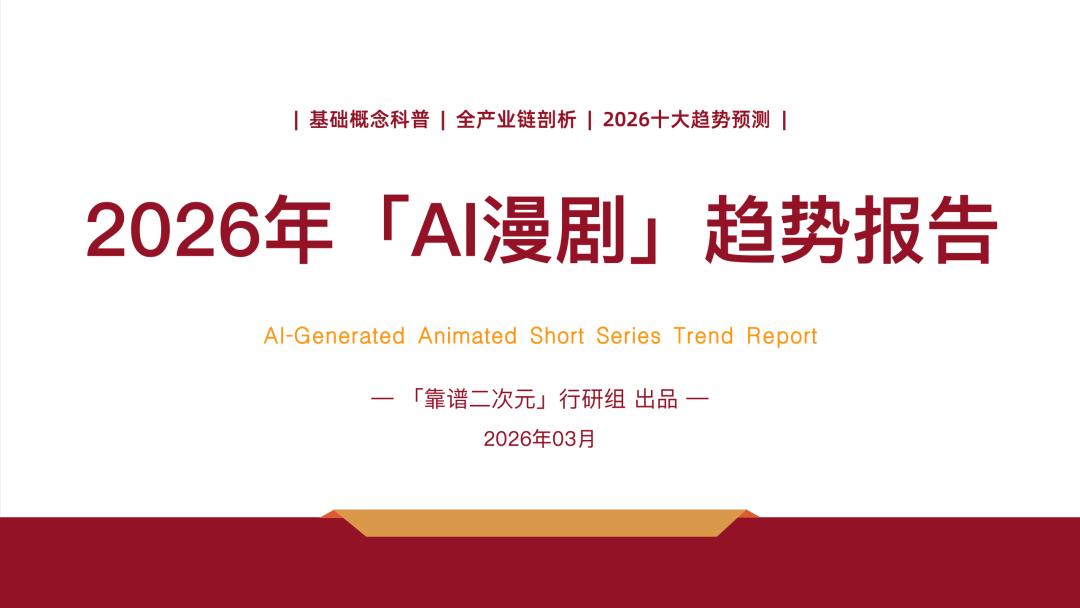 正是在这样的时间,靠谱二次元出品这份「2026年AI漫剧趋势报告」。我们认为当下的AI漫剧行业需要一份兼具基础科普功能和产业趋势洞察的深度报告,为关注AI漫剧的相关人士提供宏观层面了解产业的参考资料,也旨在为风口一线匆忙赶路的从业者提供一次驻足思考的契机。