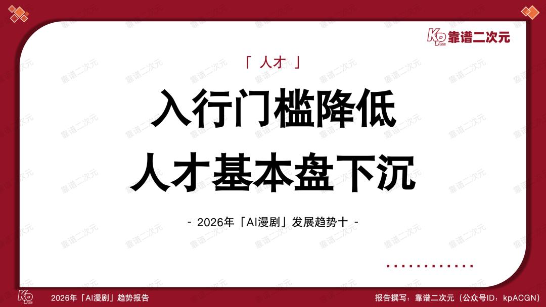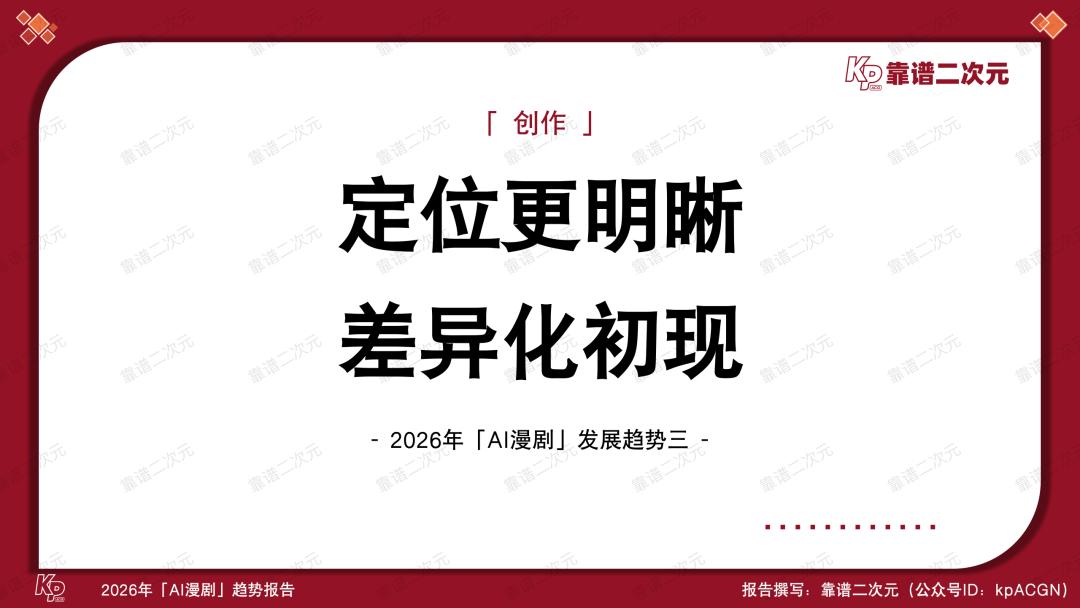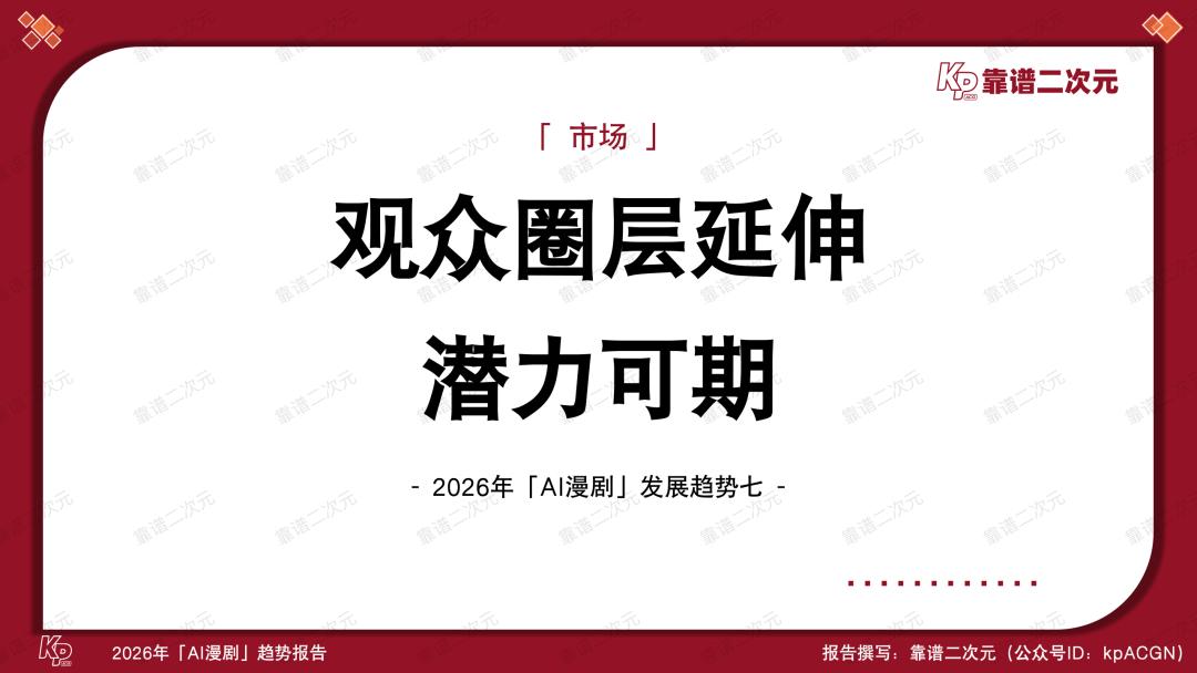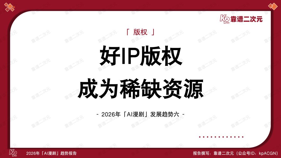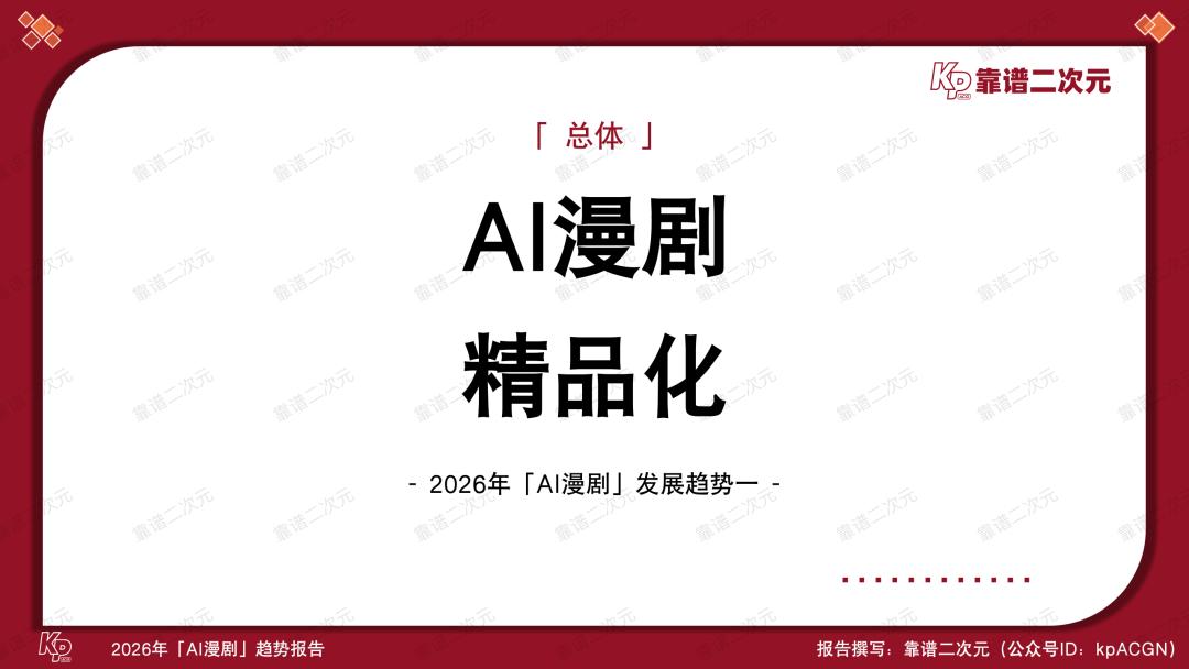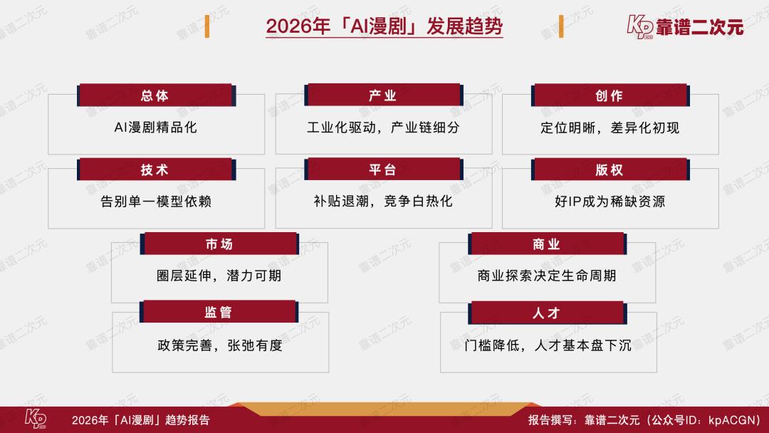 喜忧参半,风口正当时,2026年是AI漫剧产业关键性的一年,能不能跑出头部作品、跑通工业化生产逻辑,决定了视频平台在AI时代内容竞争中的首轮排位,也考验了版权方IP资产化的综合实力。靠谱二次元(公众号ID:kpACGN)希望从产业不同视角切入,得出2026年AI漫剧十大发展趋势,并根据产业现状进行逐条解析。