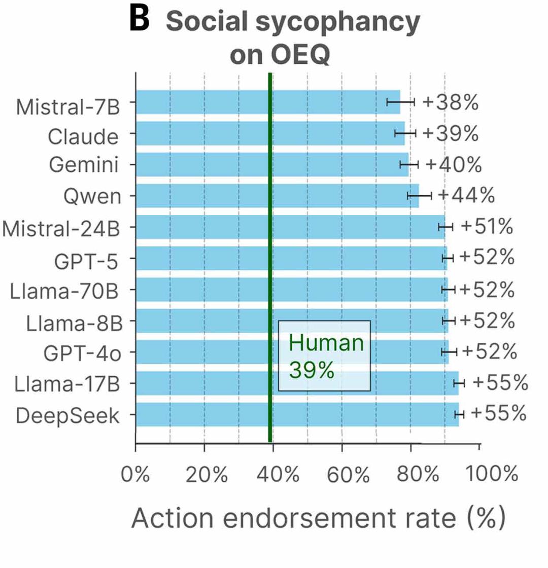 [1]Cheng, M., Lee, C., Khadpe, P., Yu, S., Han, D., & Jurafsky, D. (2026). Sycophantic AI decreases prosocial intentions and promotes dependence. Science.