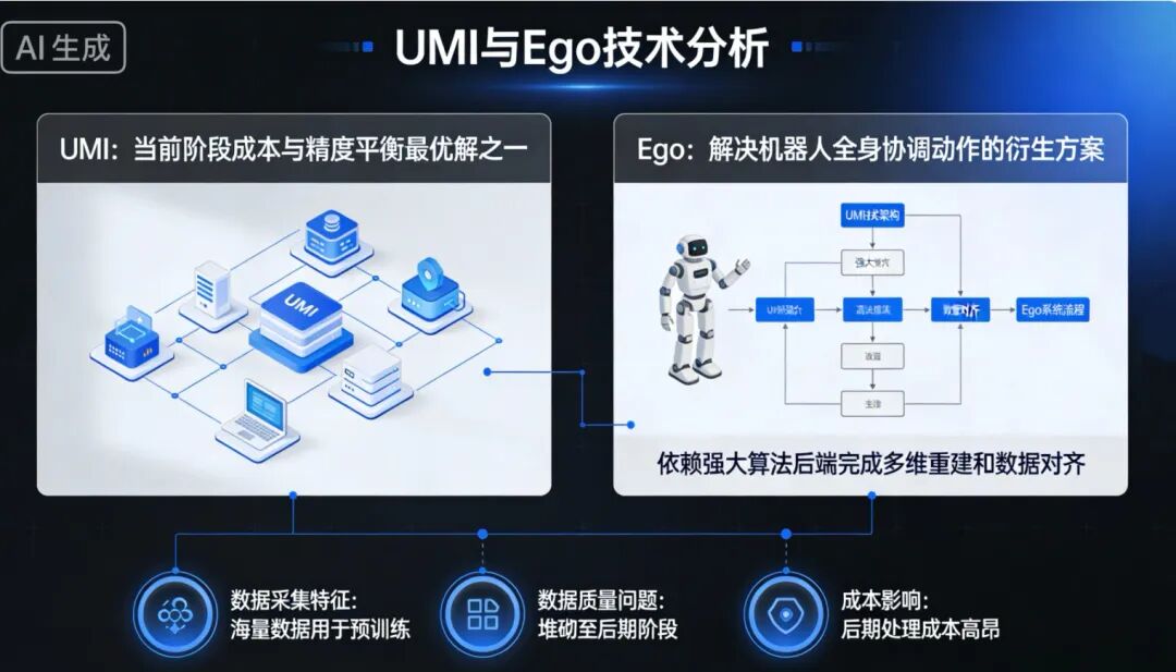 但对于聚焦单一操作任务的中小企业而言,UMI 仍是当前阶段 “成本与精度平衡” 的最优解之一;由此衍生出解决机器人全身协调动作的解决方案 Ego,但是 Ego 也出现依赖强大的算法后端做完成多维重建和数据对齐的难题,并且两者在数据采集中更偏向提供海量数据用于预训练,数据质量问题堆砌到后期,而这个阶段会付出很高的成本。