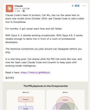 3月19日,Claude官方博客刊出了Cat Wu署名的文章《AI指数级进化下的产品管理(Product management on the AI exponential)》,她的头衔是“Claude Code产品负责人”。