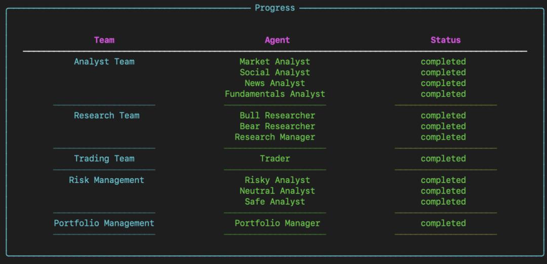 它的玩法很简单,在系统里设好几个专业角色协同干活,有基本面分析师、情绪分析师、技术分析师、研究员、交易员、风险管理师……