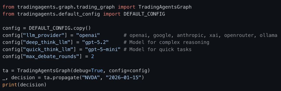 三行核心代码,propagate()直接返回决策结果,辩论轮数、LLM选择这些参数都能在配置文件里随便调。
