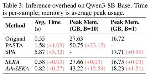 SEKA每个样本仅增加0.03秒延迟和0.03 GB显存,效率优势达到PASTA的数十倍,且完全兼容FlashAttention。