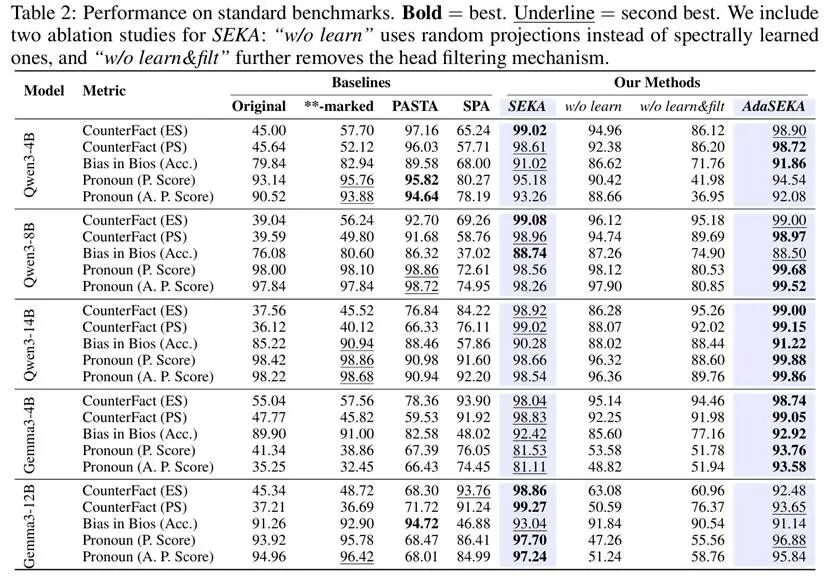 上图展示了Qwen3-8B所有层和KV头的相关性敏感度。绿色区域(高ℓ₂距离)集中在中后层的特定头上,与近期机制分析中发现的“检索头”分布高度吻合。SEKA正是利用这一发现,仅对这些敏感的KV头施加引导,避免干扰其他功能头——消融实验也证实,去掉这一筛选机制会导致性能大幅下降。