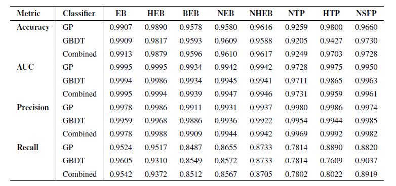 研究人员首先在训练集未见子集上测试其性能,这些子集由每个场景随机选取的 10% 事件组成,并在训练前独立隔离。模型性能通过四个关键指标进行评估:准确率(accuracy)、ROC 曲线下面积(AUC)、精确率(precision)和召回率(recall),性能测试结果见下表: