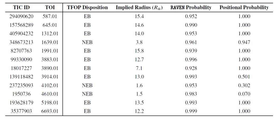 这些高概率 FP 事件中,大多数是食双星(EB),仅包含 3 个近邻食双星(NEB)事件。尽管 NEB 是样本中最常见的 FP 类型,这表明在 RAVEN 识别 NEB 时表现有效。实际上,对于 2 个 NEB 事件(TOI-4102.01 和 TOI-4610.01), RAVEN 流程确定其位置信息概率低,并正确地将最高概率分配给随访观测确认的真实宿主。