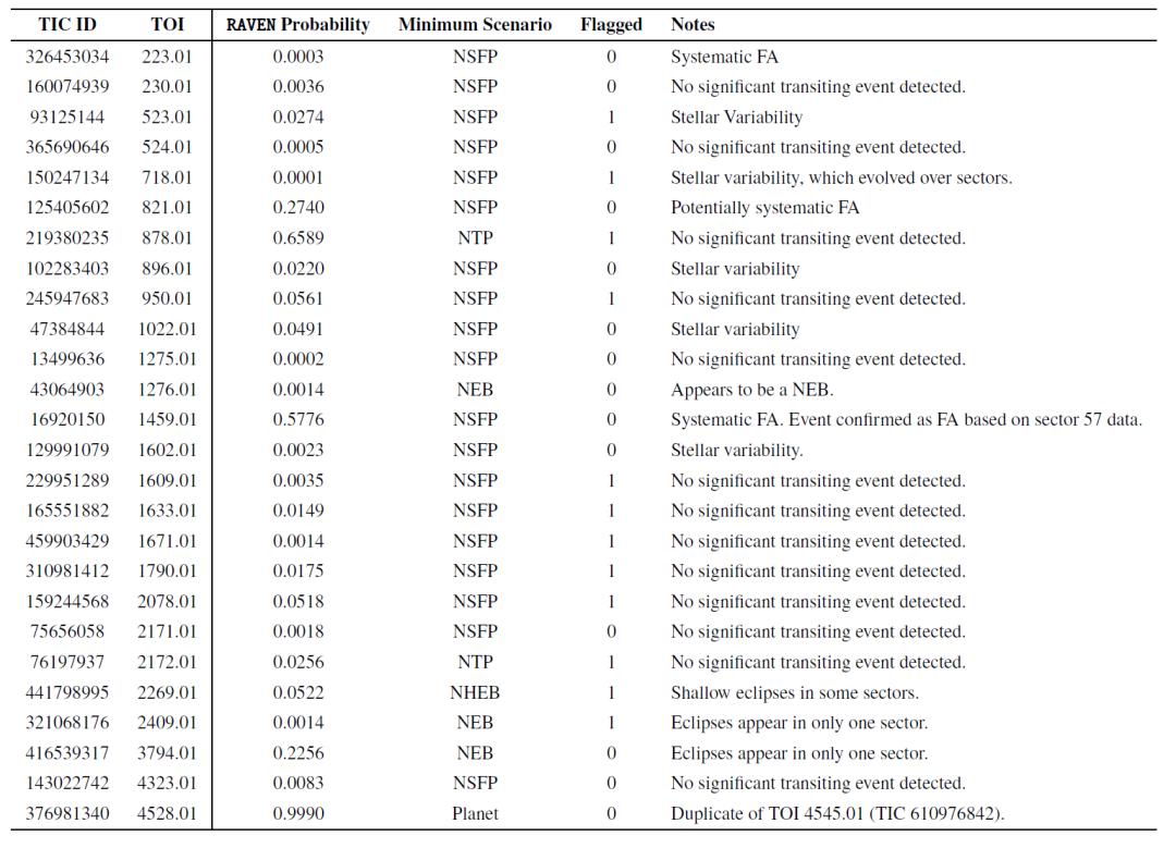 同时,研究人员也评估了 RAVEN 流程在假警报(FA) TOI 上的表现,下表展示了样本中 26 个 FA TOI 的最低后验概率,以及最低概率对应的 FP 情景。几乎所有 FA TOI 的概率与行星情景不一致,显示 RAVEN 能够有效识别它们。