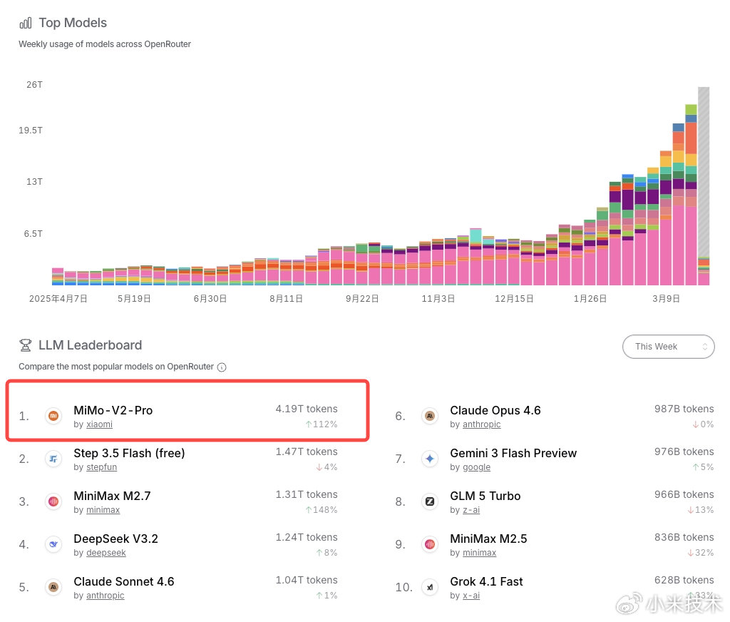 具体来看,MiMo-V2-Pro 最近一周 token 消耗量突破 4 万亿,蝉联周榜第一。最新月榜数据显示,MiMo-V2-Pro 上线不到半个月时间,累计 Token 消耗量已超 6 万亿,成为新晋月榜第一大模型。